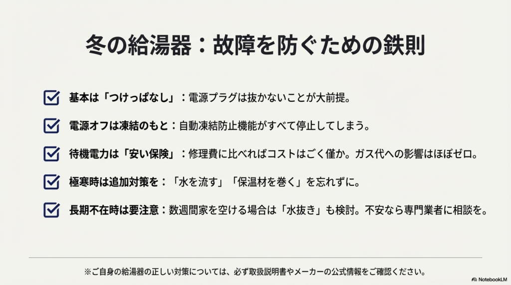 冬場は給湯器の電源プラグを抜かず、基本的に待機状態(つけっぱなし)にするのが正しい対策